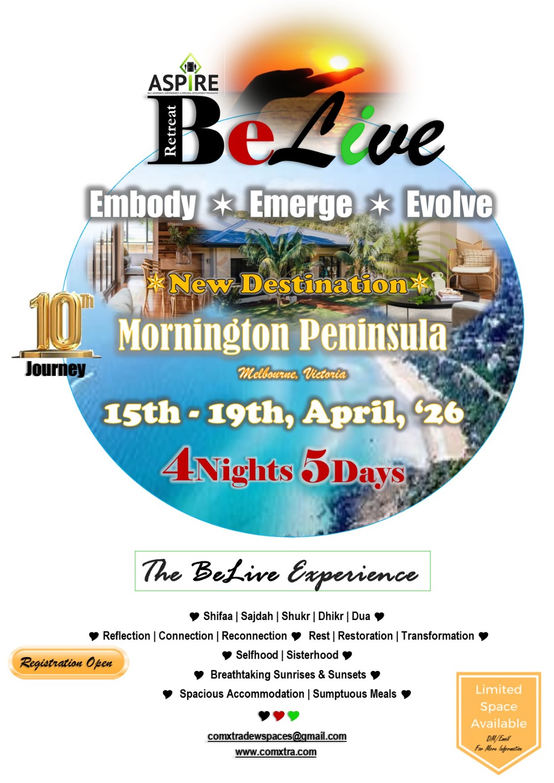 The Aspire BeLive Retreat 2026 destination has been redirected. While the original plan was the Gold Coast, this year’s journey will now take place in the beautiful Mornington Peninsula. In shaa Allah, the Gold Coast will be for another journey.